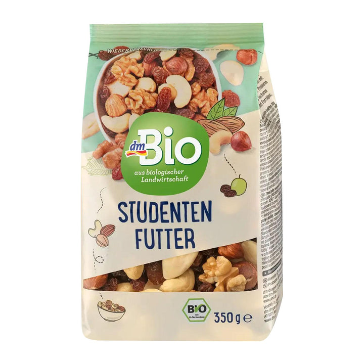 The dmBio trail mix is a crunchy-sweet mix in which aromatic almonds meet cashews, hazelnuts and walnuts in combination with fruity grapes and sultanas. The trail mix is perfect as a delicious snack or for refining mueslis and porridges. Ingredients: Cashews, Almonds peeled, Hazelnets Kernels, Walnut Kernels, Grapes, Sultanas.