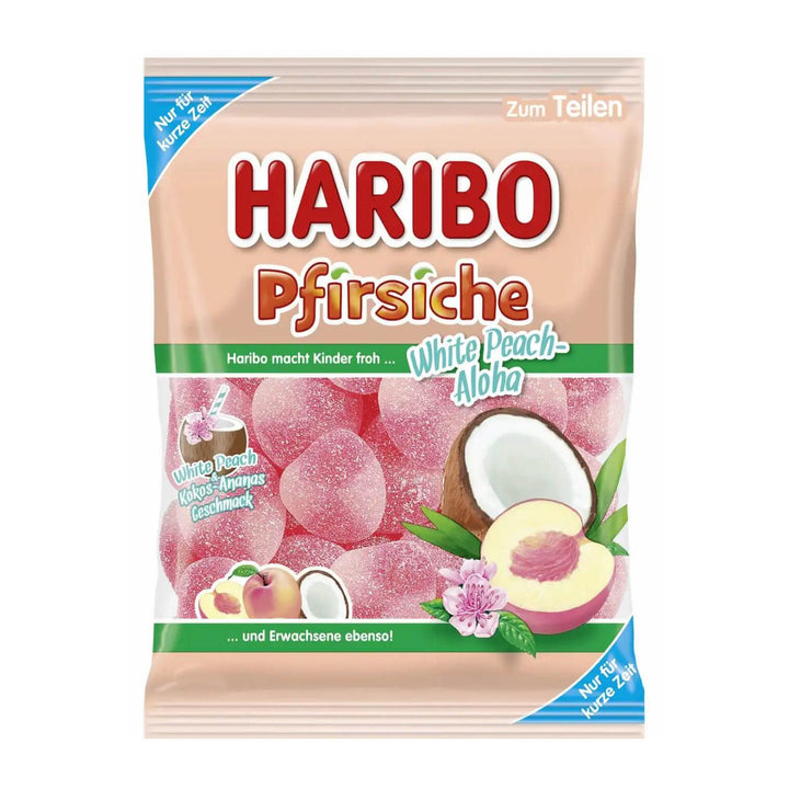 Haribo Pfirsiche White Peach-Aloha 175g are gummy candies with a delightful white peach flavor. This product offers a sweet and tangy taste, providing a chewy and enjoyable snack experience. Haribo are perfect for sharing with friends or enjoying as a treat. Savor the fruity flavor and fun texture of Haribo Pfirsiche White Peach as a delightful indulgence.